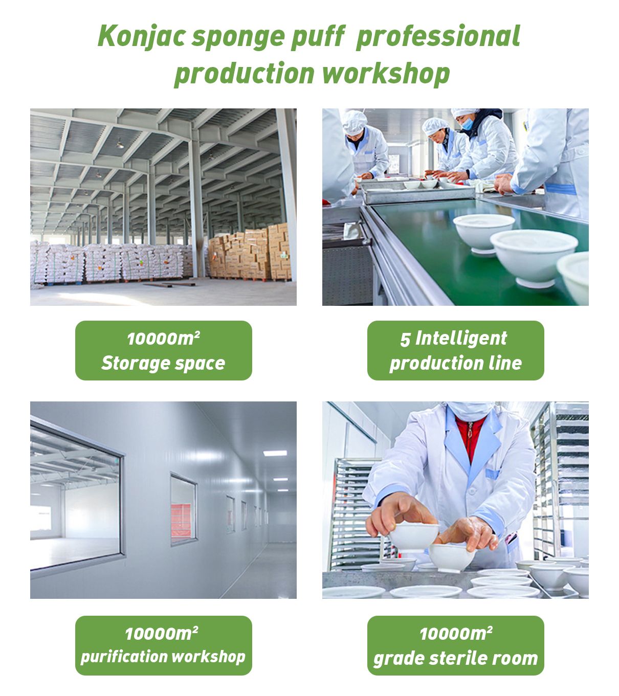 And let's not forget our **10,000m² grade sterile room**! Here, we maintain the highest levels of sterility to guarantee that our konjac sponges are not only effective but also safe for your skin.
